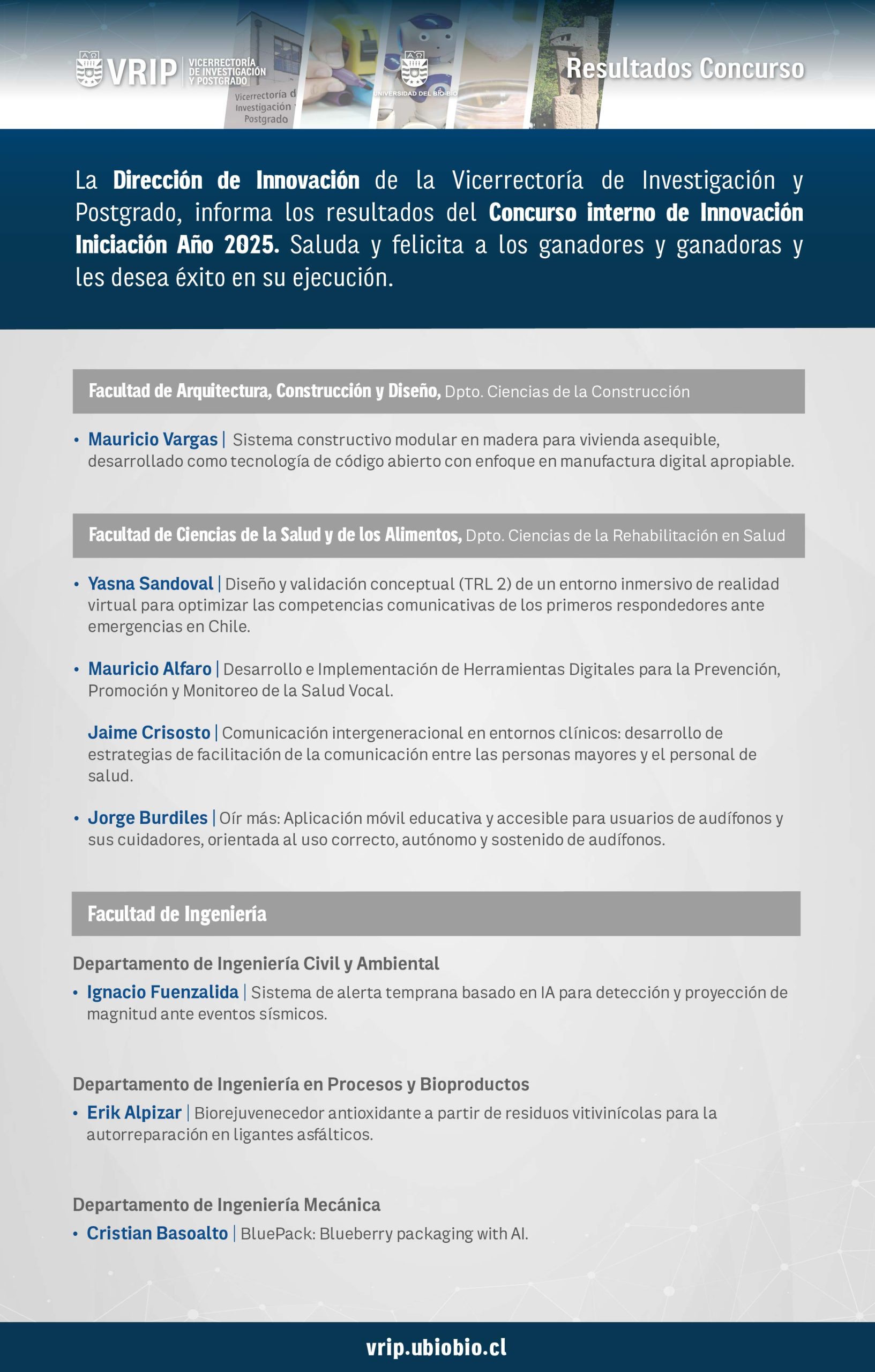 La Vicerrectoría de Investigación y Postgrado y la Dirección de Innovación, junto con la Unidad de Proyectos y la Oficina de Transferencia y Licenciamiento OTL-UBB, les invita a participar.