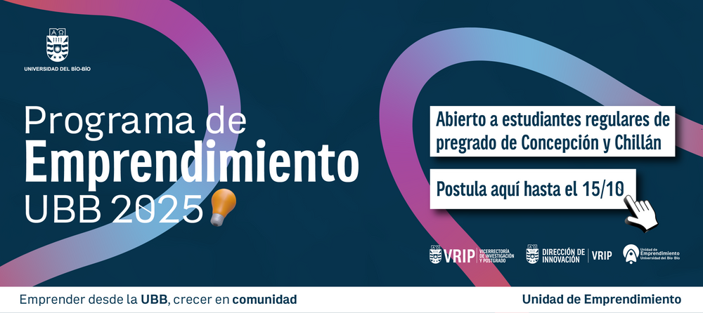 La Dirección de Innovación junto a la Unidad de Emprendimiento UBB te invitan a ser parte de este programa dirigido a estudiantes de Pregrado que quieran desarrollar su espíritu innovador y transformador. Este programa te entregará las herramientas, conocimientos y experiencias para convertir tus ideas en proyectos con impacto real. Inscripciones: https://forms.