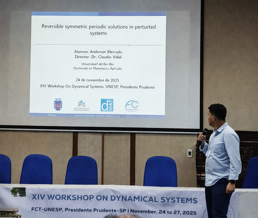 Diego Vergara expuso «Estabilidad de soluciones de equilibrio de sistemas Hamiltonianos periódicos en presencia de resonancias múltiples de orden 5» donde planteó la continuación del estudio realizado por la matemática rusa Olga Kholostova. “Este trabajo busca demostrar la condición de estabilidad o inestabilidad de las soluciones de equilibrio de un tipo de ecuaciones diferenciales ordinarias llamadas Hamiltonianas, cuando existen relaciones enteras entre los valores propios de la linealización en dicho equilibrio”.